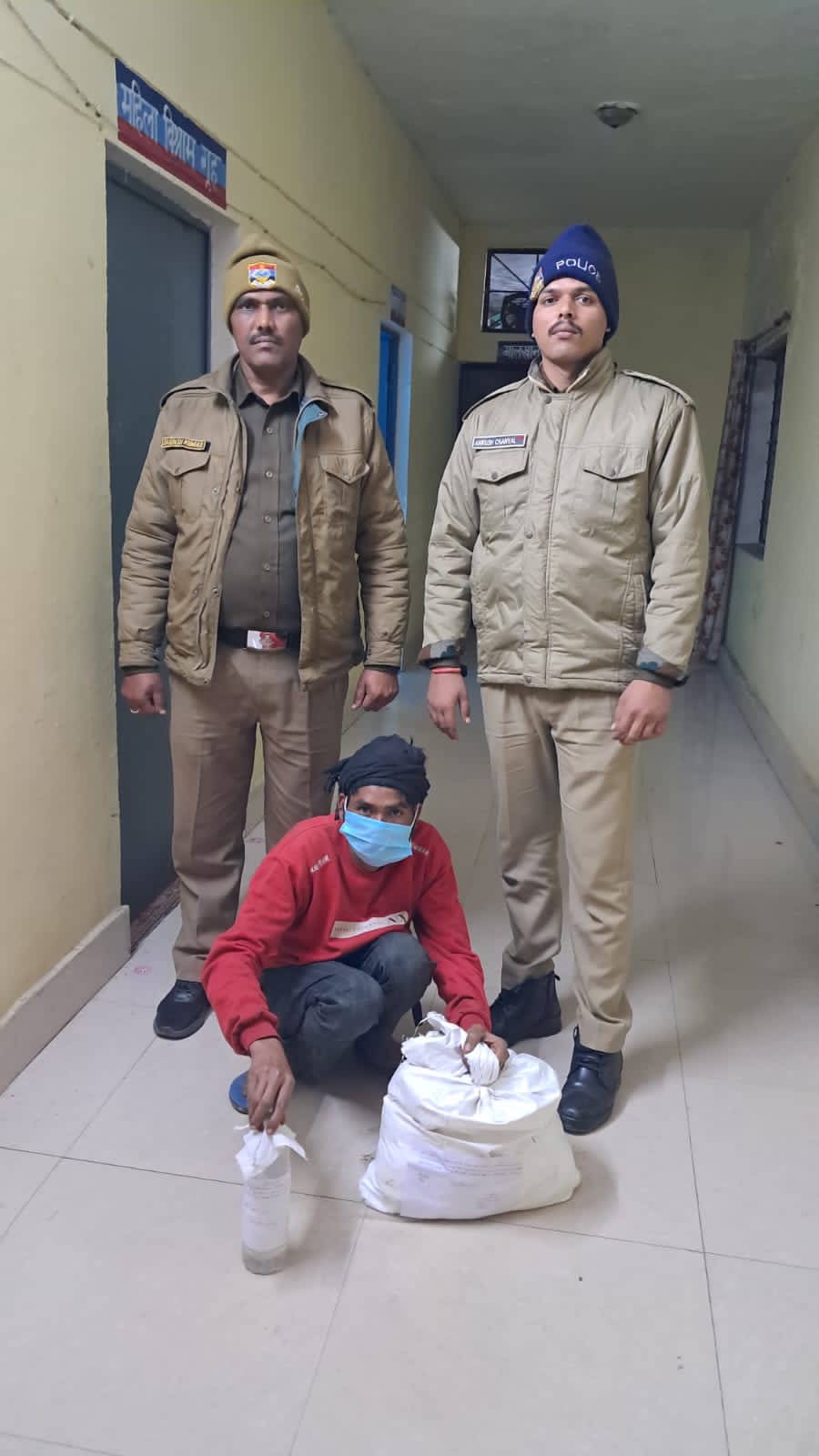 पुलिस टीम ने चैकिंग के दौरान *वीरेंद्र सिंह राणा पुत्र भगवत सिंह राणा* निवासी सुनार धड़ा थाना चोरगलिया जनपद नैनीताल उम्र 33 वर्ष को *40 पाउच अवैध कच्ची शराब के साथ गिरफ्तार* किया । उक्त अभियुक्त के विरुद्ध आबकारी अधिनियम में मुकदमा दर्ज कर विधिक कार्यवाही की जा रही है ।
