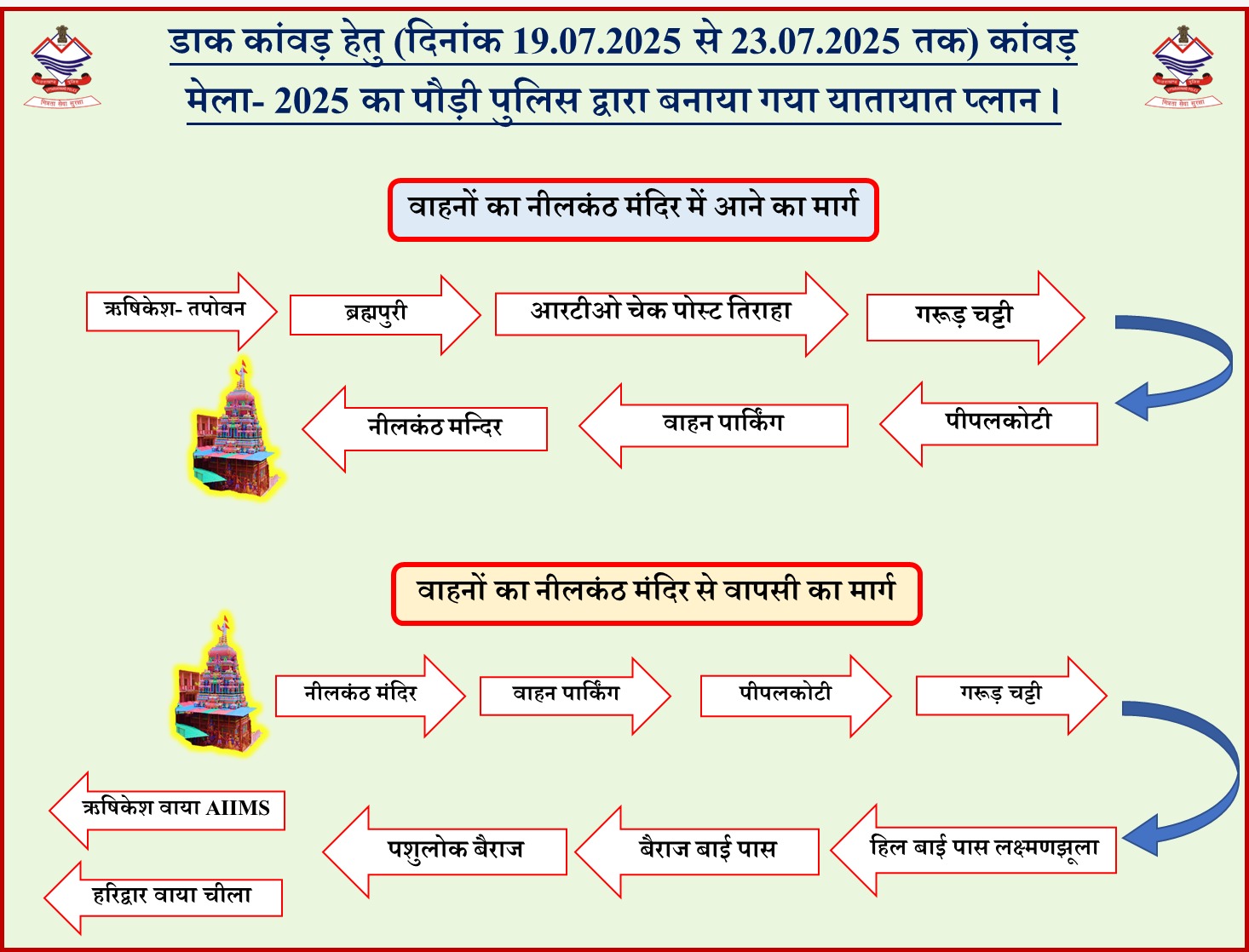 पौड़ी | नीलकंठ कांवड़ मेला क्षेत्र में यातायात हेतु वन- वे सिस्टम पूर्णतः लागू किया जा चुका है जिससे कि कांवड़ मेला में आने वाले सभी श्रद्धालुओं के लिए आवागमन सरल, सुविधाजनक व बिना किसी दुर्घटना के सुचारू रूप से संचालित हो सके साथ ही स्थानीय नागरिकों को भी किसी प्रकार की कोई असुविधा ना हो इसका भी पूर्णतः ध्यान रखा गया है । इस दौरान नीलकंठ मंदिर में आने वाले दोपहिया व चौपहिया वाहन ऋषिकेश,तपोवन,ब्रह्मपुरी होते हुए आरटीओ चेक पोस्ट तिराहा से गरूड़ चट्टी,मोहन चट्टी,पीपलकोटी होते हुए जिला परिषद् बैरियर के आस पास बनी पार्किंग में अपने वाहनों को पार्क करेगें तत्पश्चात पैदल नीलकंठ मंदिर में दर्शन हेतु जाएगें । नीलकंठ मंदिर में दर्शन के बाद सभी श्रद्धालुओं के वाहन वापसी के लिए जिला परिषद् पार्किंग से पीपलकोटी होते हुए गरूड़ चट्टी पहुंचेगें तत्पश्चात हिल बाईपास,बैराज बाईपास से होते हुए बैराज से ऋषिकेश की ओर या वाया चीला होते हुए हरिद्वार की ओर जाएंगे । पैदल मार्ग पर यात्रा करने वाले श्रद्धालु जानकी पुल व रामझूला से बाघखाला,मौनी बाबा आश्रम,पुण्डरासू होते हुए मंदिर में प्रवेश करेंगे तथा वापसी हेतु इसी मार्ग का प्रयोग कर जानकी पुल से ऋषिकेश की ओर जाएंगें। अत्यधिक भीड़ होने पर जानकी पुल से केवल पैदल चलने वाले श्रद्धालुओं की वापसी होगी प्रवेश नहीं। जानकी पुल से स्थानीय पास धारक,स्कूली बच्चे,असहाय व्यक्तियों, बीमार आदि लोगों के दुपहिया वाहनों को ही प्रवेश दिया जाएगा ।