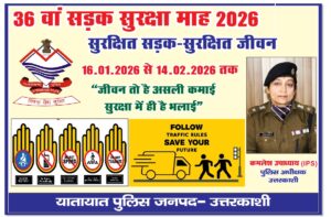 उत्तरकाशी | यातायात नियमों तथा सडक सुरक्षा के प्रति जागरुकता बढ़ाने के उद्देश्य से *पुलिस अधीक्षक उत्तरकाशी कमलेश उपाध्याय के निर्देशन में यातायात पुलिस उत्तरकाशी द्वारा 16 जनवरी-14 फरवरी 2026 तक “36वां सड़क सुरक्षा माह” आयोजित किया जा रहा है
